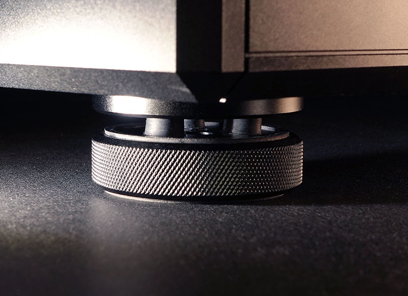 Das schwere, aus Aluminium gefräste Gehäuse ist unter den geometrischen Drehpunkten aufgehängt und befindet sich in einer optimalen mechanischen Gleichgewichtsposition. Die dadurch erzielte Immunität gegen Erschütterungen oder Schwankungen wird zusätzlich im verbauten Federsystem mit kritisch gedämpften Alpha-Gel-Koppelelementen gegen alle äußeren Vibrationen und Resonanzen isoliert.