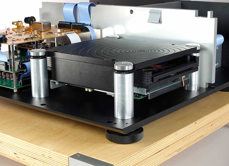Das optische Disc-Antriebssystem des ORIGO ist ein hochgradig angepasstes Inhouse-Design. Das Schlüsseldesign ist die tiefe Schwerpunktfederung. Dieses Konzept wird häufig bei Plattenspieler-Design verwendet, es werden dadurch Schwingungen des Mediums CD und SACD gen Null reduziert.