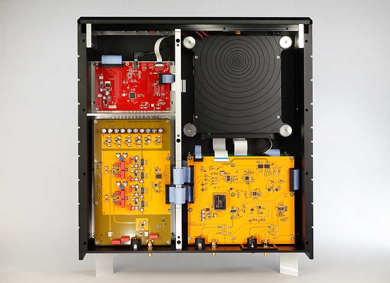 10 mm dicke, massive Aluminium-Motortüren bieten eine luftdichte Abschirmung gegen Außengeräusche. Zwischen den einzelnen Kammern, wie der Stromversorgung, dem Disc-Loader, dem Mikrocontroller, dem DSP und dem DAC, werden gefräste Aluminium-Trennwände und ferromagnetische Abschirmplatten verwendet. Die Kommunikation zwischen den nicht-audiobezogenen Schaltkreisen ist galvanisch durch eine kapazitive Barriere-Schnittstelle isoliert.